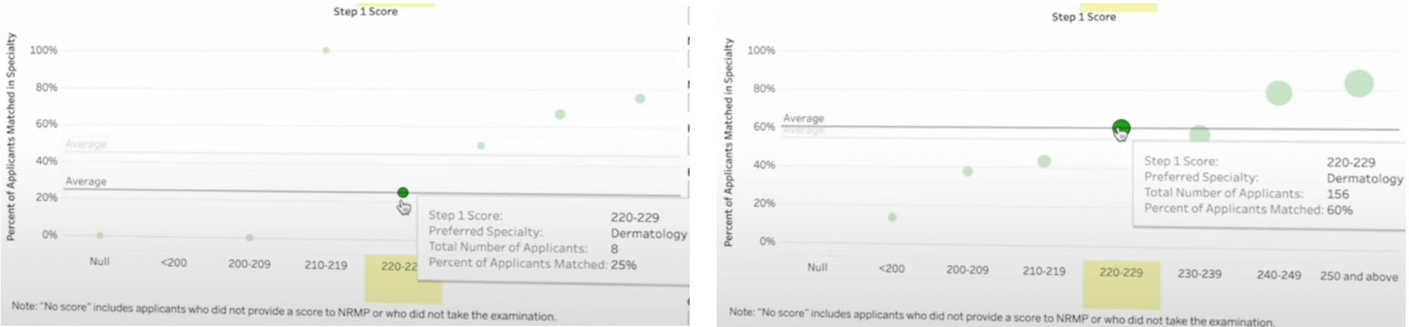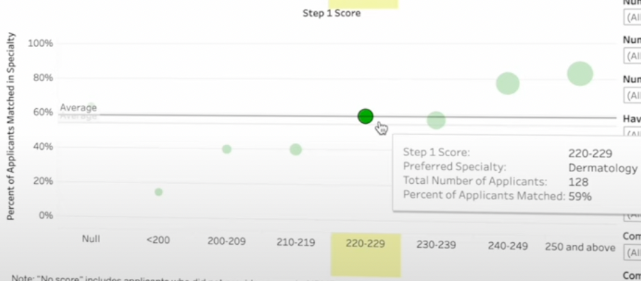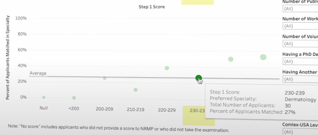 We can use the NRMP interactive matching outcomes to investigate dermatology (a competitive specialty). There was a 60% match rate for US grads who had research, and a 25% match rate for those with 0 research.